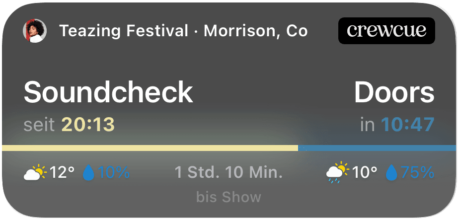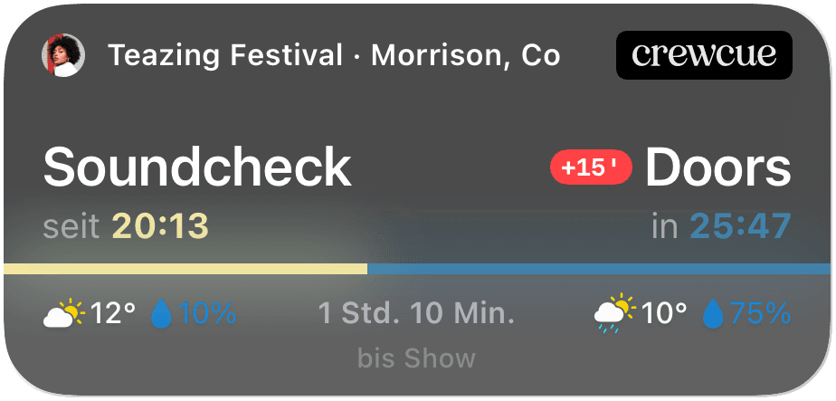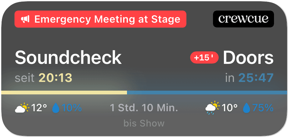 CrewCue brings your production's day sheet directly to the lock screen — with countdown, delays and crew alerts.