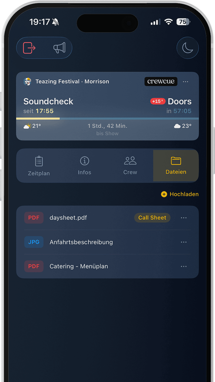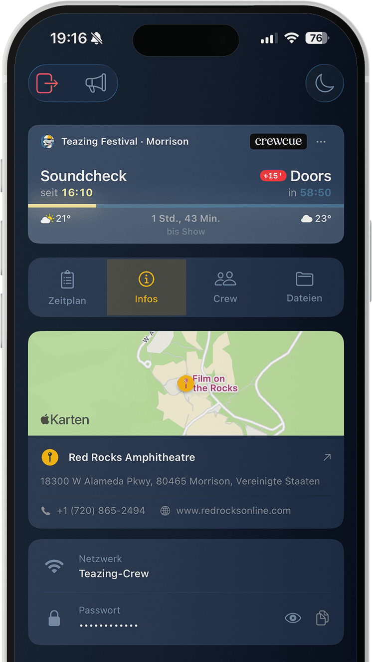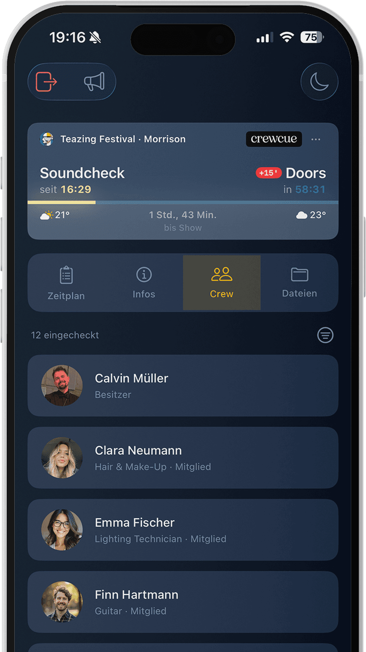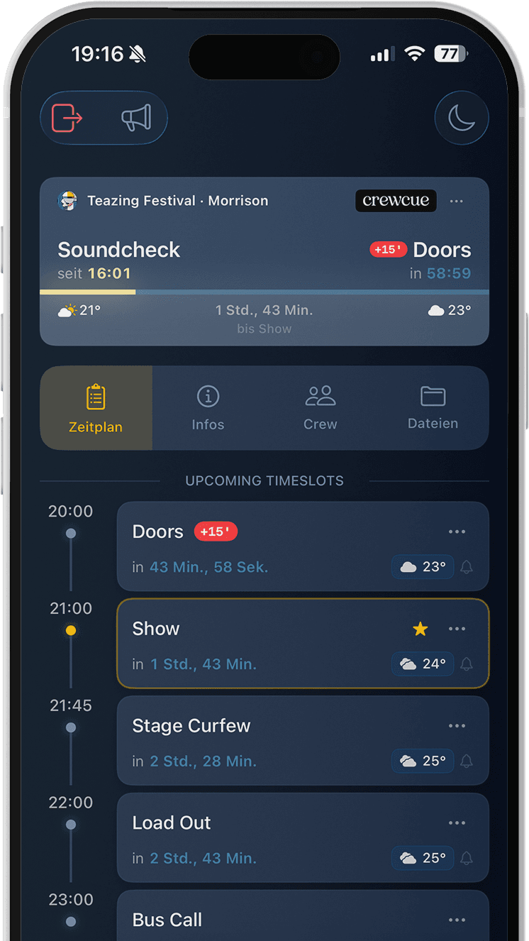 Whether it's a stage, festival or conference — CrewCue adapts to your workflow.