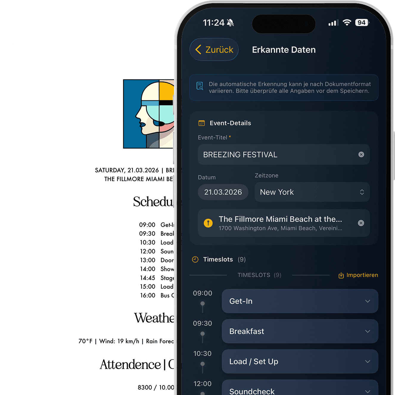 Take a photo, pick an image from your library or open a PDF — timeslots, times and titles are automatically recognized and filled into the form.